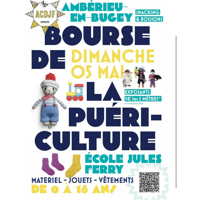 L' acdjf (association des classes de découverte de l’école jules ferry) organise une bourse de la puériculture ( 0-16 ans ) dans la cour de l'école primaire jules ferry à ambérieu-en-bugey le dimanche 05/05/2024 de 08:00 à 17:00, ouverte à tous