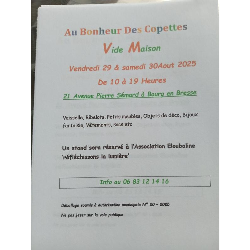Les copettes vident leurs maisons ! Venez chiner des petits meubles, de la vaisselle, de la déco et des vêtements...Un stand sera réservé à l'association 'eloubaline réfléchissons la lumière '
