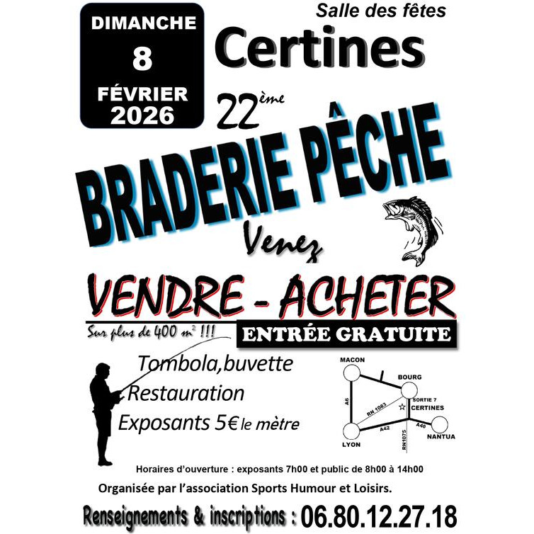 L'association certinoise sports humour et loisirs organise sa 21ème braderie pêche, le dimanche 5 février de 8h à 13h.