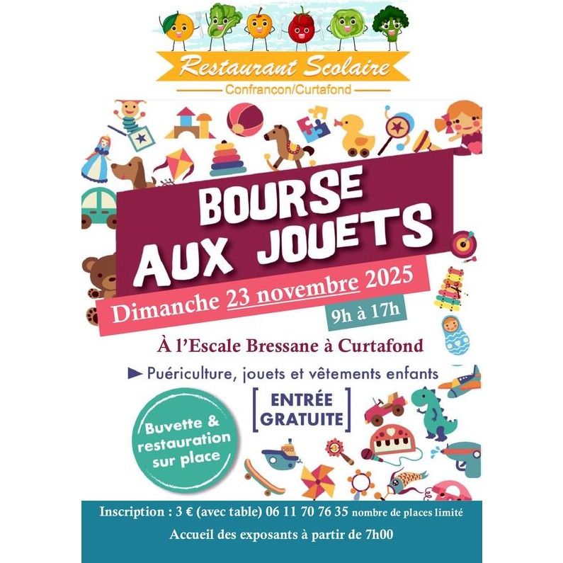 Le restaurant scolaire de confrançon-curtafond organise sa 1ère bourse aux jouets, objets de puériculture et vêtements enfants, dans la salle des fête l'escale bressane à curtafond.