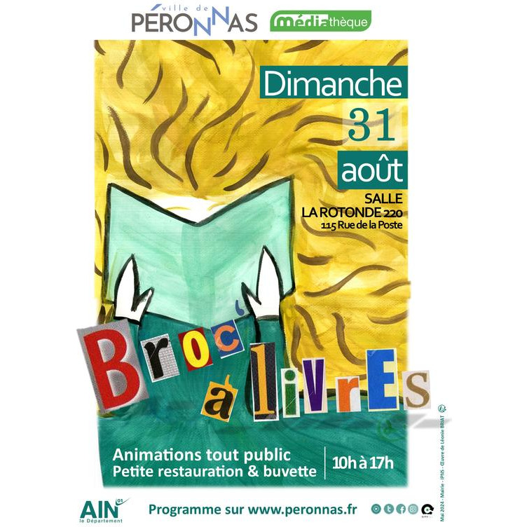 La ville de péronnas et la médiathèque municipale organise pour la 5ème année consécutive « broc’à livres » : une brocante de livres d’occasion à la salle la rotonde, le dimanche 31 août, ouverte au public de 10h à 17h. Au programme de cette journée : - atelier "poissons" de 10h à 12h tout public – en accès libre venez créer votre poisson en bâtonnets ou en origami. Animation proposée par l’équipe médiathèque. - atelier "recycle" de 14h à 16h tout public – en accès libre fabriquez votre vase en livre recyclé. Ajoutez quelques fleurs de papier, le tour est joué ! Animation proposée par l’équipe médiathèque. - "c’est l’histoire d’un seau" à 16h15 lectures à voix haute –jeune public – en accès libre – durée 30 min eléphant, grenouille, tigre, canard, crabe, chien, âne et crocodile, sortis des histoires, se sont tous donnés rendez-vous au fond d’un seau de plage. Histoires d’animaux proposées par catherine et laurie. - spectacle "plumes & boucles d’ours" 2 representations : à 10h et à 11h salle la rotonde 75 pour toute la famille – dès 2 ans – durée 32 min - ours en peluche bienvenus ! Par aurélie loiseau, conteuse "boris est un petit ours qui fait des bêtises, du lundi au dimanche. Toujours avec son canard, il invente des histoires ou lui vole dans les plumes. Un jour, il a rencontré une petite fille aux cheveux d’or. Ca lui a frisé le poil !" histoires d’ours à plumes ou au poil, librement inspirées des albums "boris" de mathis. >> sur réservation ou à et d'autres surprises à découvrir... Buvette et petite restauration sur place. On vous attend nombreux pour cette 5ème édition !