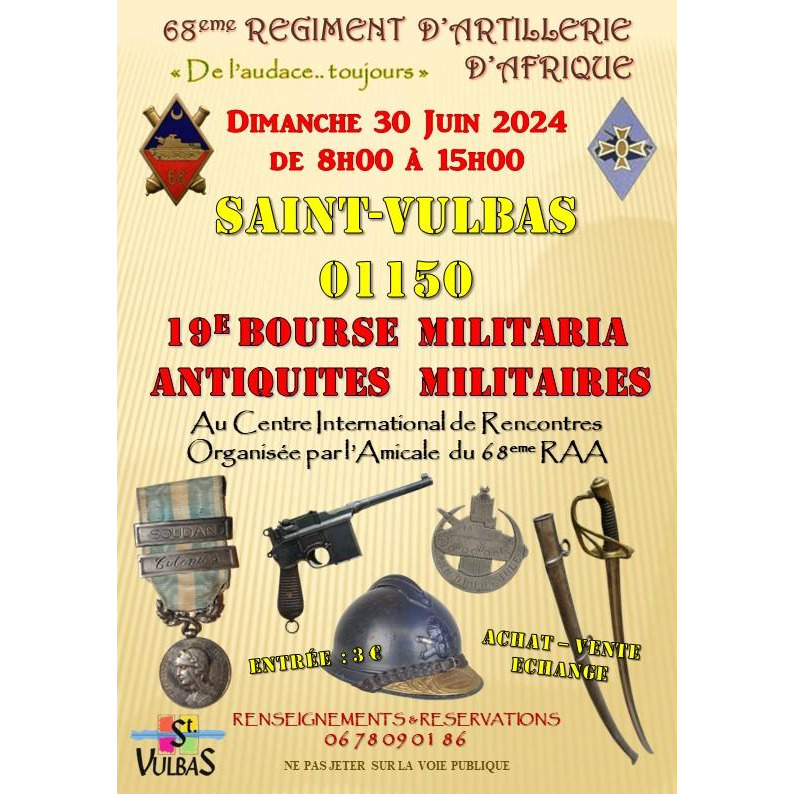 19e bourse militaria organisée par l'amicale du 68e régiment d'artillerie d'afrique, stationnée au camp militaire de la valbonne, le dimanche 30 juin 2024 à saint-vulbas 01150 de 8h à 15h. Cette nouvelle manifestation est organisée au centre international de rencontres de saint-vulbas, à proximité de la centre nucléaire du bugey et à quelques kilomètres du camp militaire de la valbonne, par l'équipe habituelle de l'amicale du 68, qui organise en décembre la bourse de anse 69.