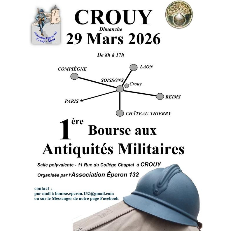 Notre association, eperon 132, organise sa toute première bourse aux antiquités militaires à crouy, proche de soissons, en bout de chemin des dames, le dimanche 29 mars 2026 de 8h à 17h. A la salle polyvalente 11 rue du collège chaptal, crouy (02880).
