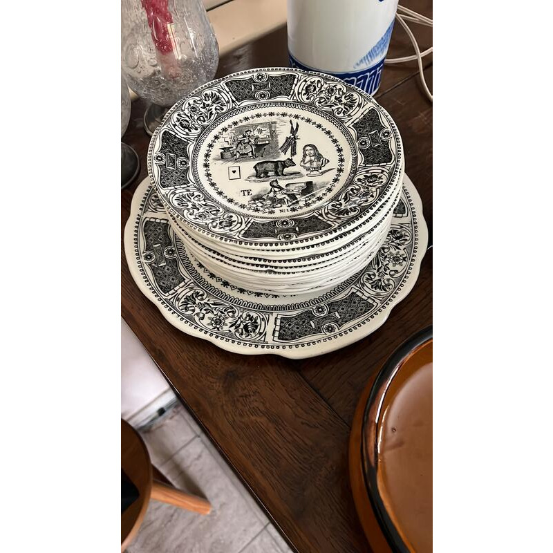 Composé de bibelots vaisselle livres meubles fauteuil bibliothèque chaise table verres etc….