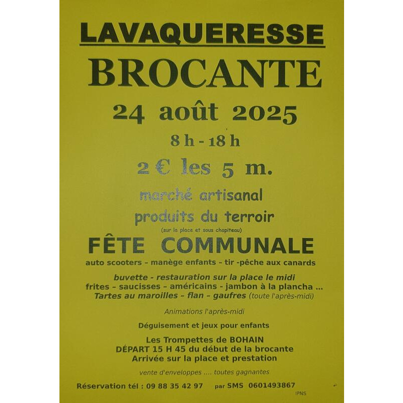 Brocante accueillant une 50 aine d'exposants. Fêtes communales avec auto-scooter, petit manège et tir. Restauration le midi sous chapiteau (frites, saucisses, merguez, jambon à la plancha, tarte au maroilles maison, flans, gaufres). Animation musicale l'après midi par les trompettes de bohain. Marché artisanal sous chapiteau sur la place : miel, cidre objet déco, etc.