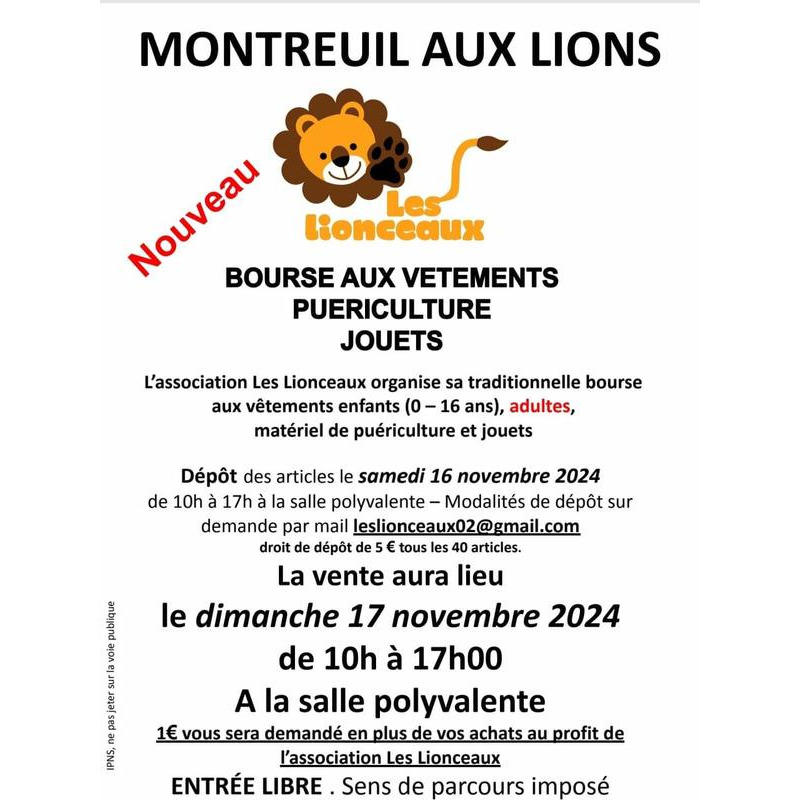 nous sommes ravis de vous rappeler que notre prochaine bourse aux vêtements se tiendra le 17 novembre de 10h à 17h à la salle communale de montreuil-aux-lions. C'est l'occasion idéale pour renouveler la garde-robe de vos petits et dénicher des trésors pour vos enfants !