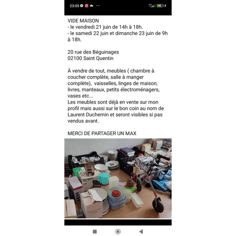 vente de tous, vaisselle, linge de maison, meuble ( salle à manger, chambre à coucher, etc....)