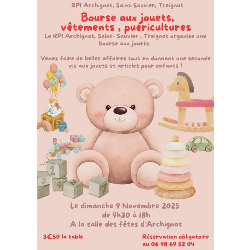 Bourse aux jouets vêtements articles de puériculture organisé par l'amicale des parents d'élèves du rpi archignat st sauvier treignat.