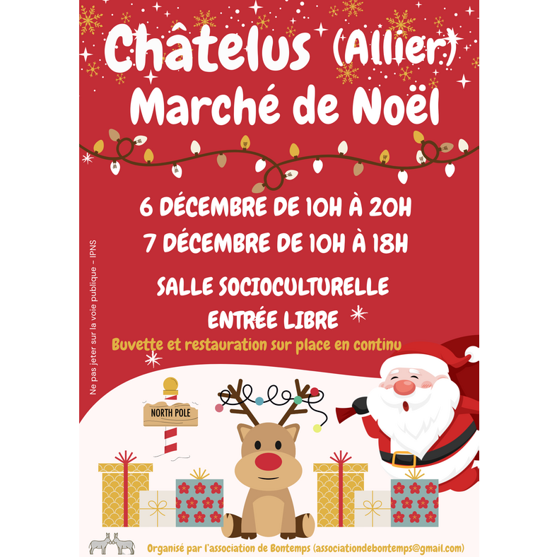 L’association de bontemps a le plaisir de reconduire cette année son traditionnel marché de noël, qui se tiendra le week-end des 6 et 7 décembre à la salle socioculturelle de châtelus (allier).