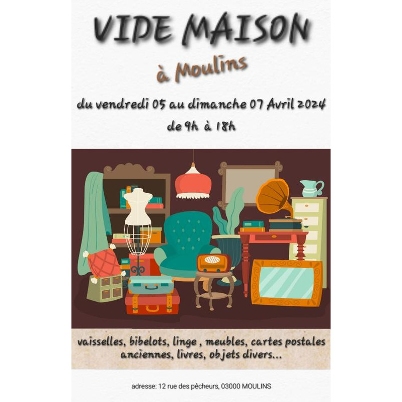 Venez chiner meubles, bibelots, vaisselles, de très nombreux livres anciens et modernes (romans (dont delly) enfance, scolarité, musique, histoire, bourbonnais, plantes, cuisine, religieux, livre pour collectionneurs...), bibelots divers, collections de chouettes, dé à coudre, cartes postales... Et divers autres petites choses.