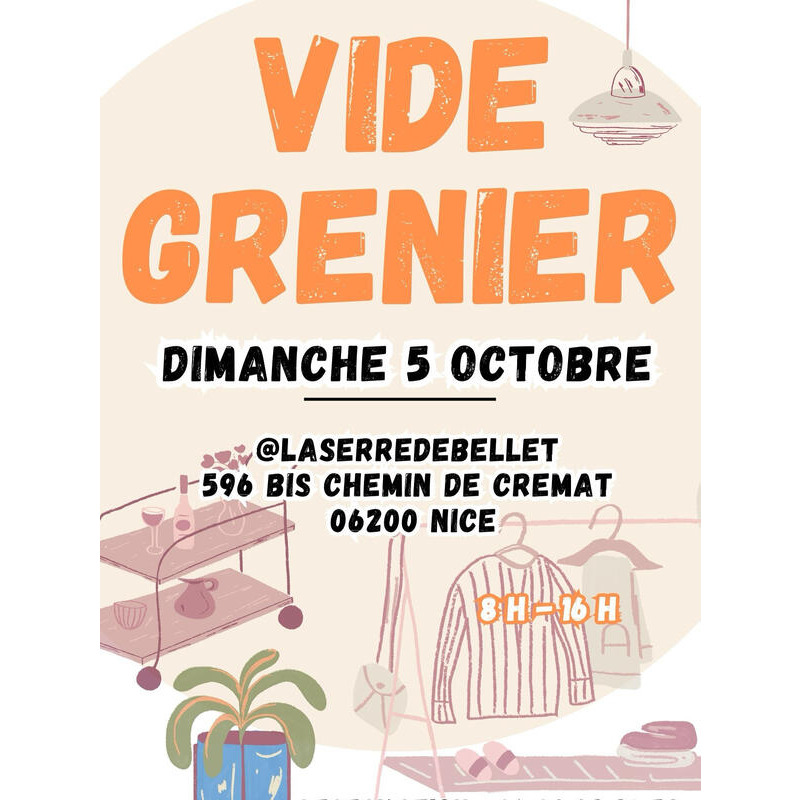 Vide grenier sur les collines de bellet ! Cadre champêtre dans un pré au milieu des oliviers avec vue château ! Nous espérons vous voir nombreux et nombreuses pour venir faire du shopping ou tout simplement pour vider vos greniers, placards ! Buvette sur place - wc - parking
