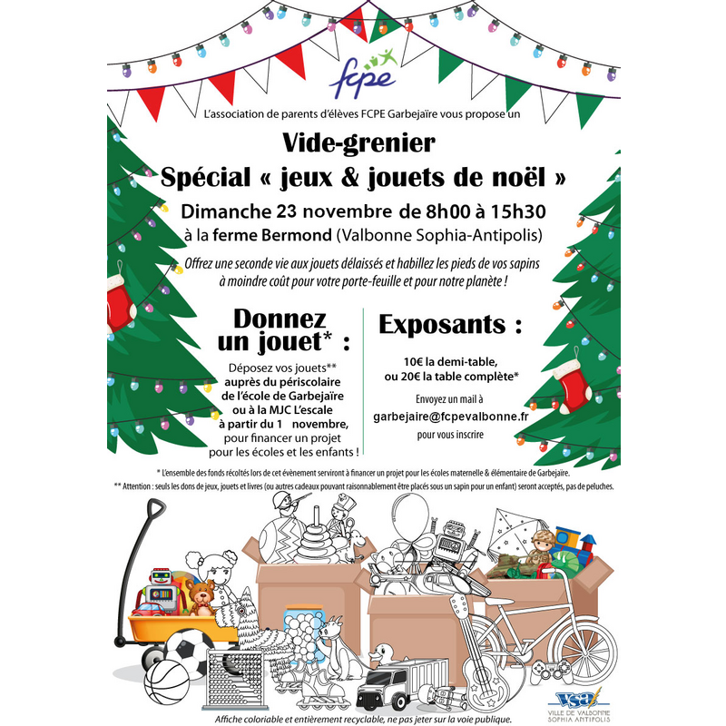 Nous organisons un vide grenier de noël le 23 novembre de 8h00 à 15h30 à la ferme bermond à sophia-antipolis. Offrez une seconde vie aux objets délaissés et habillez le pied de votre sapin à moindre coût pour votre portefeuille et la planète ! On vous attend nombreux !