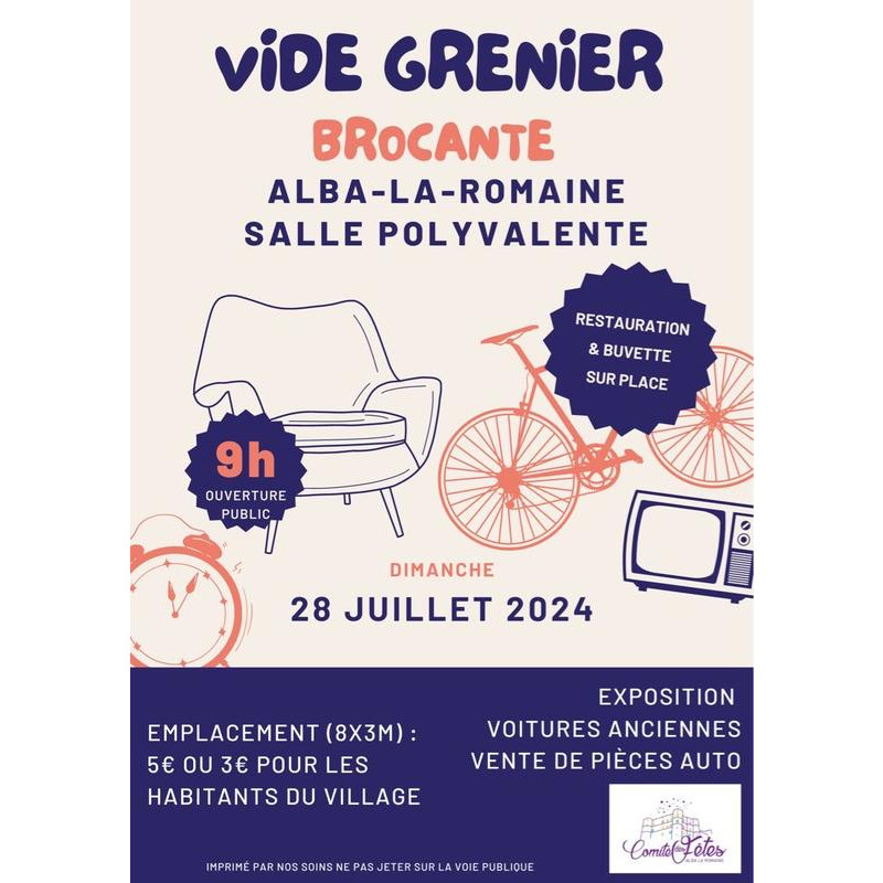 Le comité des fêtes d’alba la romaine organise son vide grenier brocante le 28 juillet 2024 à partir de 6h pour les exposants et 9h pour les visiteurs.
