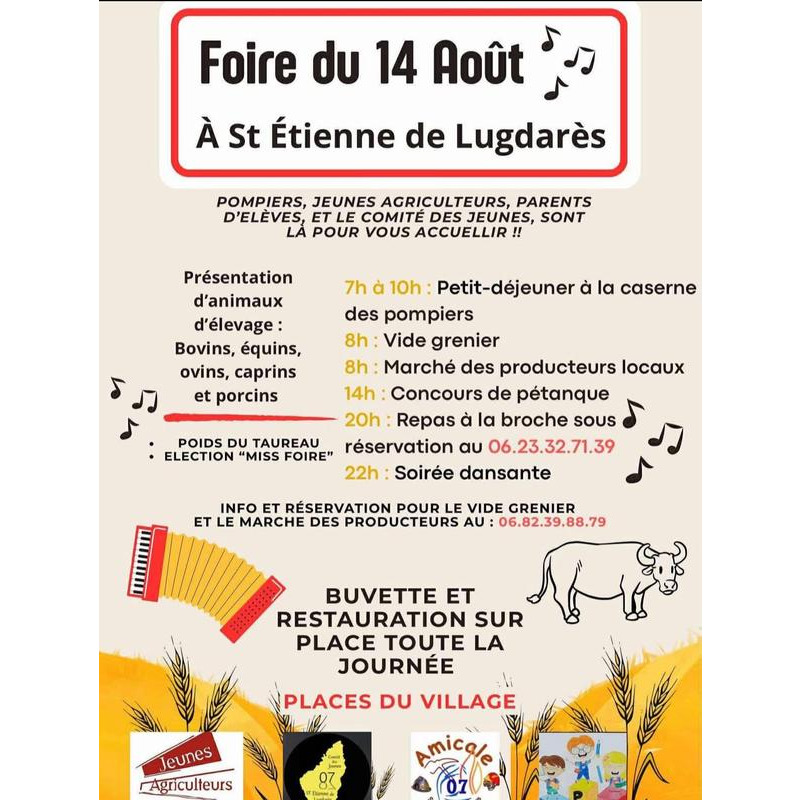 Foire avec de nombreuses animations toute la journée : exposition d'animaux, vide grenier, marché de producteurs, concours de pétanque... Et en soirée repas et bal !!!