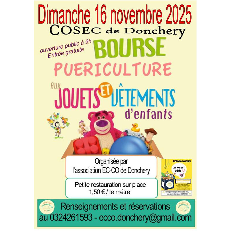 L'association ec-co organise une "bourse puériculture aux jouets et vêtements d'enfants" : dimanche 16 novembre 2025 au cosec de donchery. A cette occasion, un groupe de jeunes de donchery organisent une collecte solidaire en partenariat avec le restos du coeur. Pour cela, nous vous invitons à venir déposer vos dons de jouets et de vêtements, directement le dimanche 16 novembre 2025 au gymnase de donchery. Ces dons seront distribués pour les fêtes de noël aux bénéficiaires des restos du cœur. Pour plus d'informations, contactez l'association ec-co