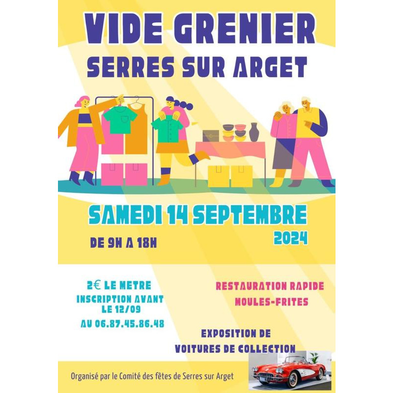 Vide grenier organisé par le comité des fêtes de serres sur arget avec restauration rapide moules-frites et exposition de voitures de collection