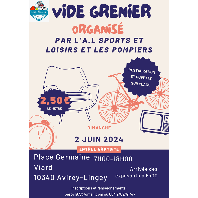 L’alsl et les pompiers organisent leur vide grenier . Restauration et buvette . 50 exposants .Pas de professionnels. Tombola organisée tout au long de la journée , un joli lot à gagner .