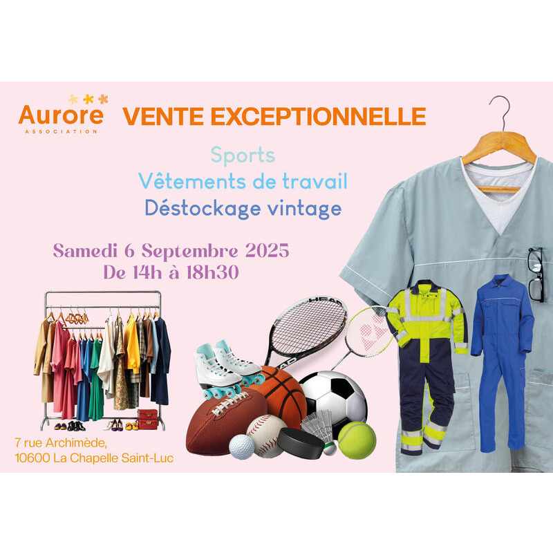 Le foyer aubois de la chapelle saint-luc vous annonce sa vente exceptionnelle d'accessoires et vêtements de sports, vêtements de travail et déstockage vintage qui aura lieu le samedi 6 septembre 2025, de 14h à 18h30.