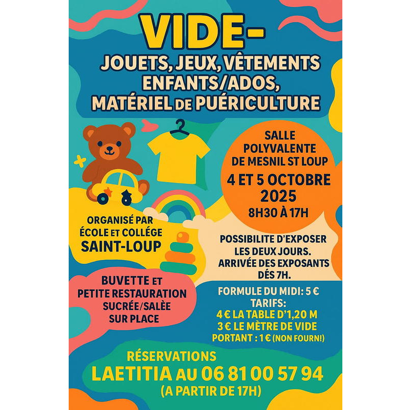 L'apel et l'école et collège de mesnil saint loup organisent leur vide jeux, jouets,vêtements enfants/ados et matériel de puériculture à la salle polyvalente le 4 et 5 octobre 2025 de 8h30 à 17h. (possibilité de s'inscrire les 2 jours).