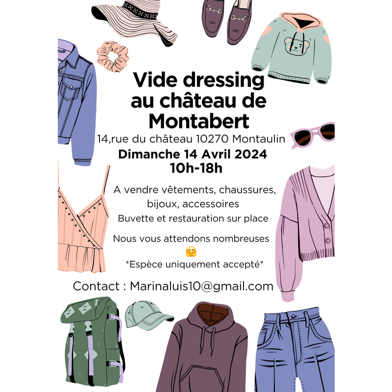 Bonjour nous organisons un vide dressing au château de montabert (dans une petite dépendance annexe au château et à l'extérieur dans le parc si le temps nous le permet )