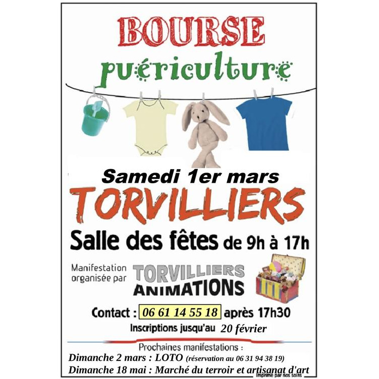 Notre bourse puériculture aura lieu le samedi 1er mars 2025 à la salle des fêtes de torvilliers de 9h00 à 17h00.