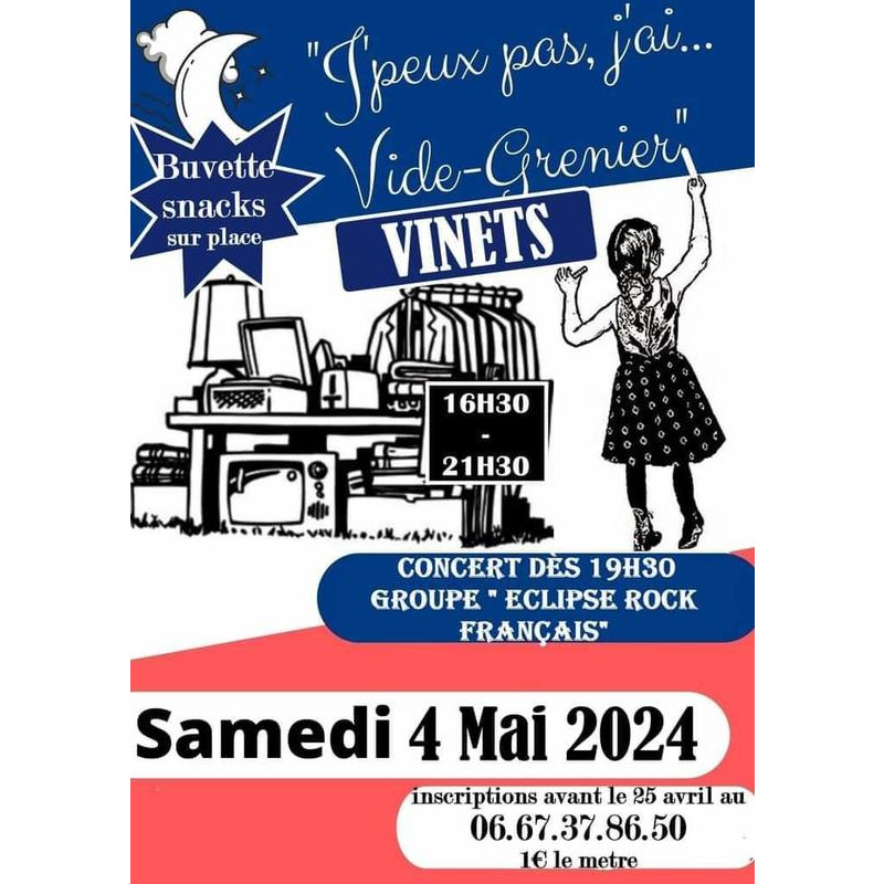 Vide grenier semi nocturne dès 16h30, concert gratuit avec éclipse rock francais dès 19h30 place de la mairie. Restauration, buvette sur place.