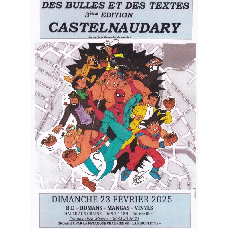Le 3ème festival bd "des bulles et des textes" organisé par "la pétanque chaurienne la piboulette" et josé marcos aura lieu à castelnaudary dans la halle aux grains, place de la république (centre-ville)