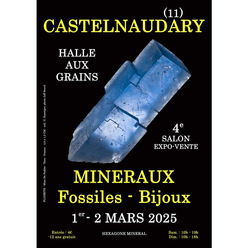 Hexagone mineral vous donne rendez-vous les 1er et 2 mars 2025 pour le 4e salon minéraux fossiles et bijoux de castelnaudary (11). Cet événement se déroulera comme les années précédentes dans la halle aux grains, idéalement située au cœur de la ville, place de la république. Les exposants professionnels ou amateurs participant à cet événement présenteront au public leurs dernières nouveautés en provenance du monde entier mais aussi de france et d'occitanie. Comme dans tous nos salons, un très large choix de minéraux, fossiles et bijoux sera proposé à la vente pour le plus grand bonheur des petits et des grands. Pour répondre toujours plus aux attentes du public, un service d'expertise gratuite sera aussi proposée par l'organisateur à celles et ceux qui souhaitent faire déterminer leurs découvertes minéralogiques ou paléontologiques. Ce rendez-vous incontournable en terres audoises devrait réunir de très nombreux passionnés de la région. Nous mettons tout en œuvre pour que ce week-end remplisse d'émerveillement les passionnés tout en sensibilisant les néophytes et les plus jeunes !
