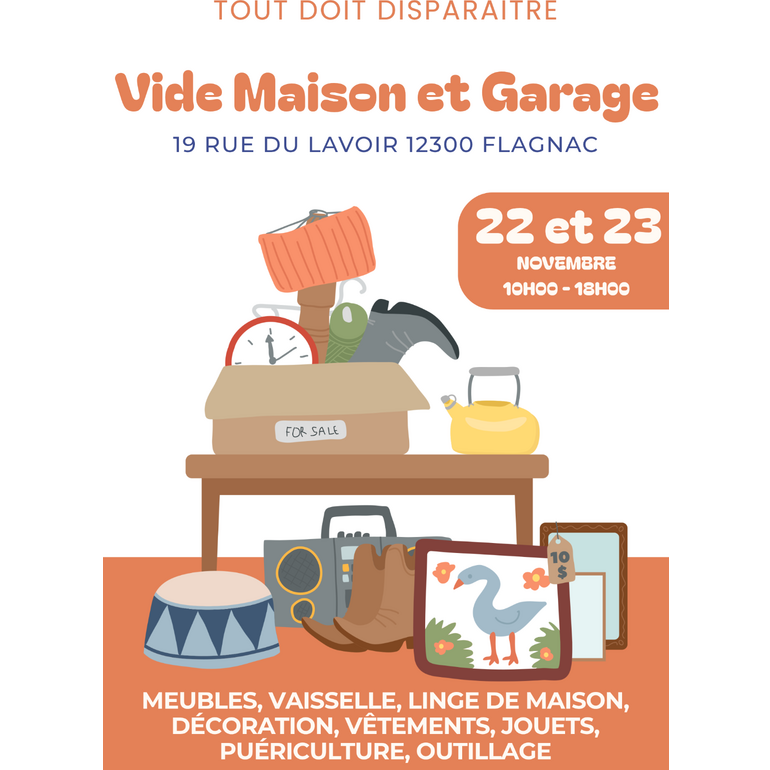 meubles, bibelots, vaisselle, livres, matériel puericulture, outils,vêtements, chaussures etc