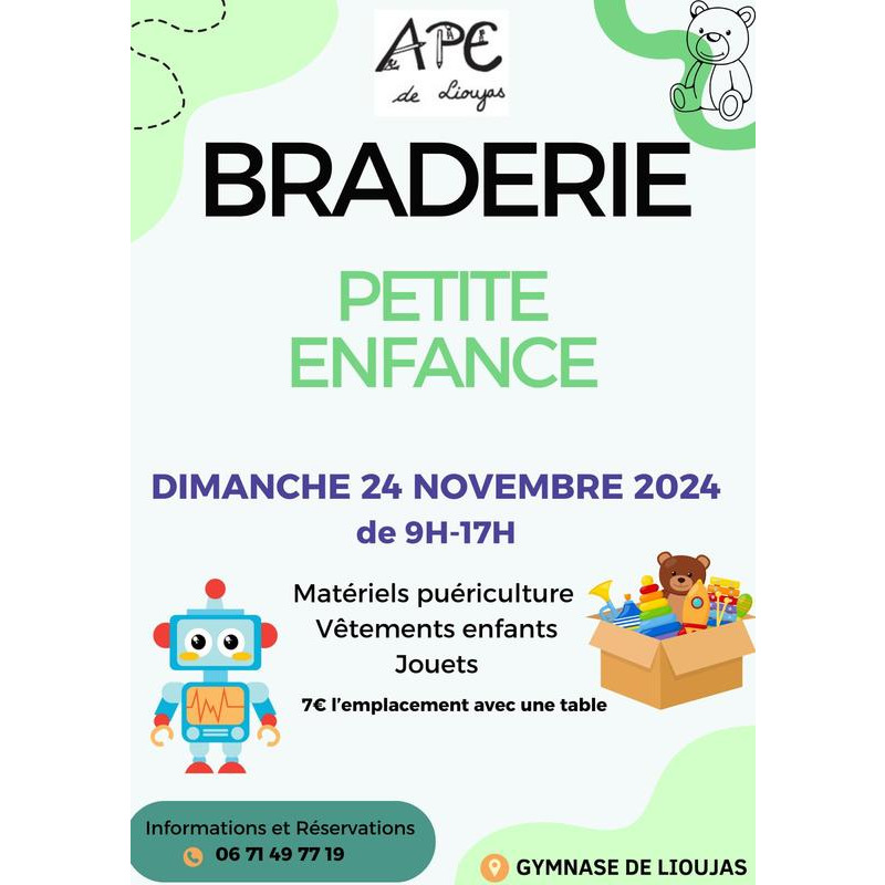 C'est I'ouverture des inscriptions pour la braderie petite enfance - bourse aux jouets que l'ape organise le dimanche 24 novembre 2024 de 9h à 17h au gymnase de lioujas.