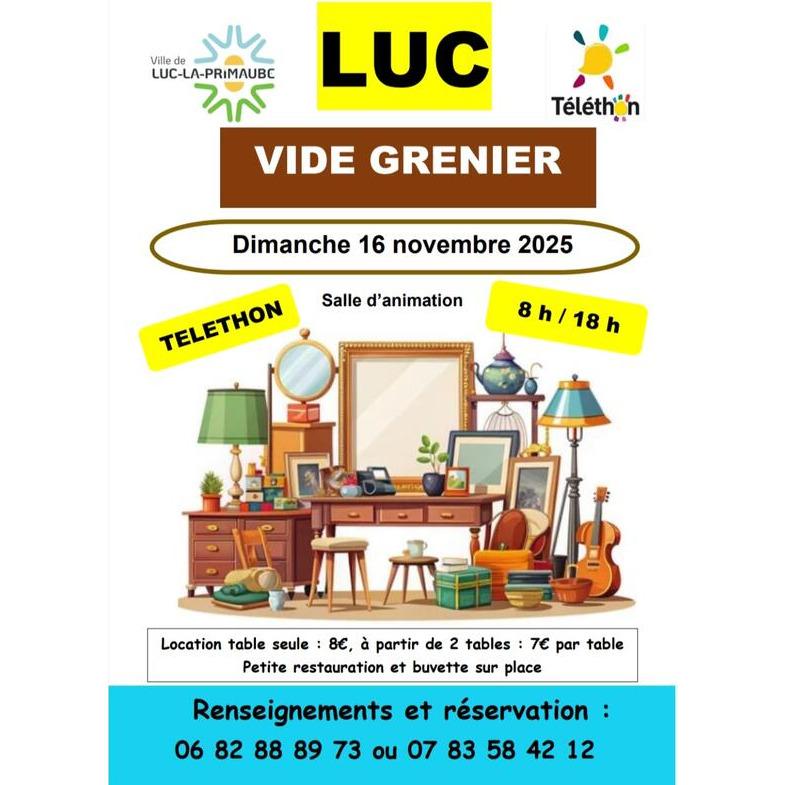 Vide grenier organisé par l'équipe téléthon de luc la primaube. Ce vide grenier se déroulera dans la grande salle d'animation de luc. Buvette et petite restauration sur place.