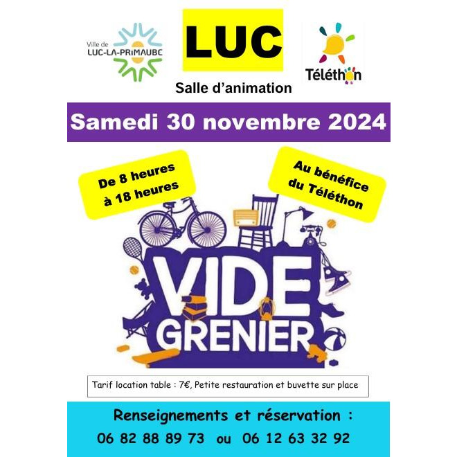 Vide grenier organisé le samedi 30 novembre 2023 par l'équipe téléthon de luc la primaube à la salle de luc. Petite restauration possible le midi.