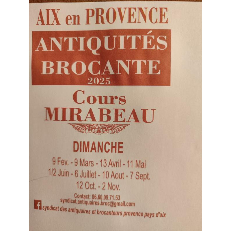 Une cinquantaine de professionnels vous attendent chaque mois sur le cours mirabeau à aix en provence pour vous présenter des pièces allant de l'antiquité classique au design du xxème siècle : mobiliers de toutes les époques, bijoux anciens, faïences, argenterie, tableaux, linge, verrerie ....... Une invitation à la découverte et au voyage dans le temps. Nous vous attendons nombreux de 8h à 18h !!!