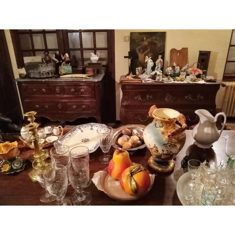 - verres anciens, cristal, faiences, lampes à pétrole, étains, linges..