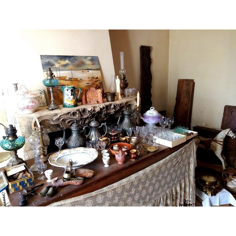 -verres anciens, cristal, faiences, assiettes, plats, lampes à pétrole, étains, linges..