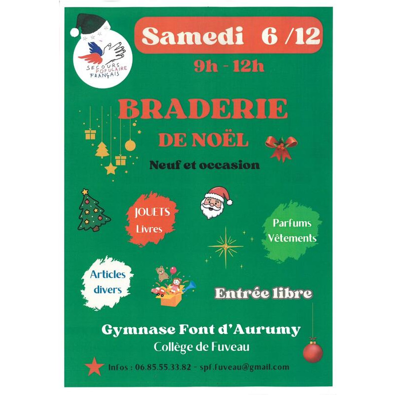 Grande braderie du secours populaire : jouets, vêtements, casquettes et chaussures, neufs et d’occasion, vous attendent.
