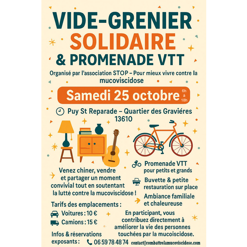 La journée de l’espoir de la durance chiner, pédaler, partager… pour mieux vivre avec la mucoviscidose samedi 25 octobre de 6h à 18h puy-saint-réparade – quartier des gravières, 13610 l’association stop – pour mieux vivre contre la mucoviscidose vous invite à une grande journée solidaire placée sous le signe du partage, de la convivialité et de l’espoir. Au cœur du quartier des gravières, au bord de la durance, nous vous proposons de participer à un événement qui rassemble petits et grands autour de deux activités phares : un grand vide-grenier solidaire et une promenade vtt familiale. Mais ce n’est pas tout ! Toute la journée, une buvette ainsi qu’un espace de petite restauration seront à votre disposition pour vous désaltérer, grignoter et partager un moment gourmand entre amis ou en famille. Au programme de la journée vide-grenier solidaire avec des dizaines de stands promenade vtt ouverte à tous, petits et grands buvette et petite restauration pour profiter d’un moment convivial autour d’un verre ou d’une assiette ambiance festive et familiale pour partager de bons moments clôture de la journée vers 18h un geste qui compte en participant à la journée de l’espoir de la durance, vous devenez acteur d’une cause essentielle : la lutte contre la mucoviscidose. Chaque emplacement réservé, chaque coup de pédale, chaque boisson partagée… est un geste d’espoir pour améliorer la vie des personnes touchées par cette maladie. Rejoignez-nous pour une journée solidaire, festive et pleine d’espoir ! Ensemble, faisons reculer la maladie et avançons vers un avenir meilleur.