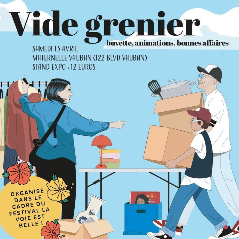 Vide-grenier festif organisé dans le cadre du festival de quartier la voie est belle ! Buvette, animations et bonnes affaires sont au programme. Un bal conclura la journée. L'ensemble des bénéfices servira à financer les projets des écoles publiques.
