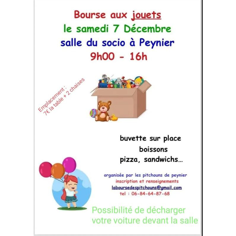 A l’approche des fêtes, l’association les pitchouns de peynier vous invite à sa grande bourse aux jouets ! Venez dénicher des trésors pour vos enfants ou vendre les jouets dont vous n’avez plus besoin.