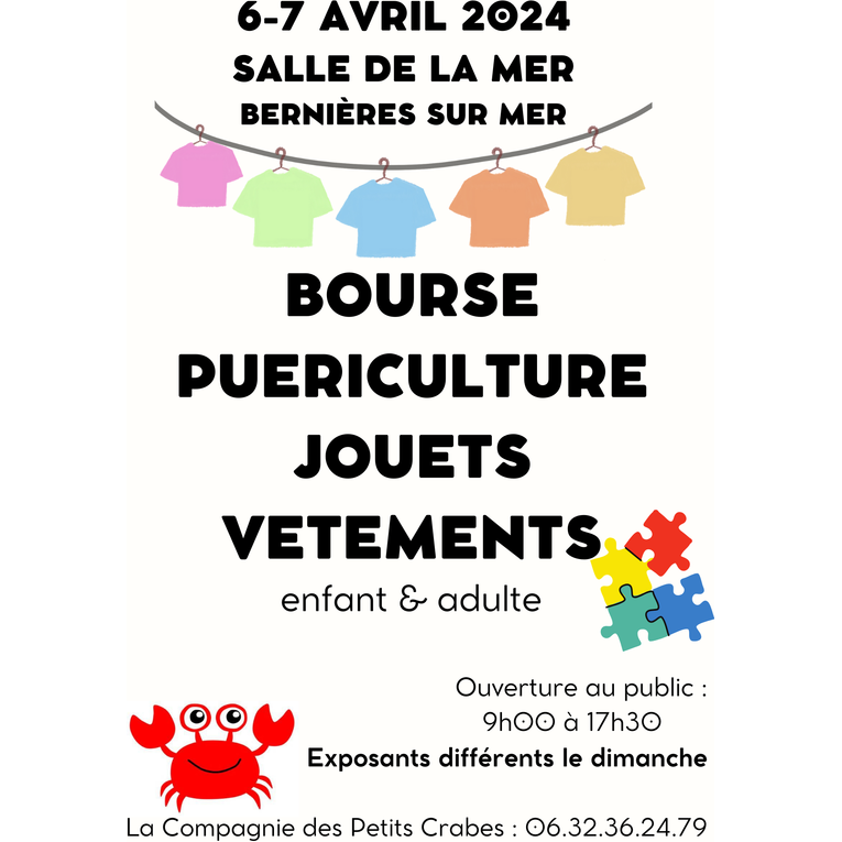 La bourse puériculture, jouets et vêtements enfant et adulte organisée par la compagnie des petits crabes revient fin novembre à la salle de la mer à bernières-sur-mer.