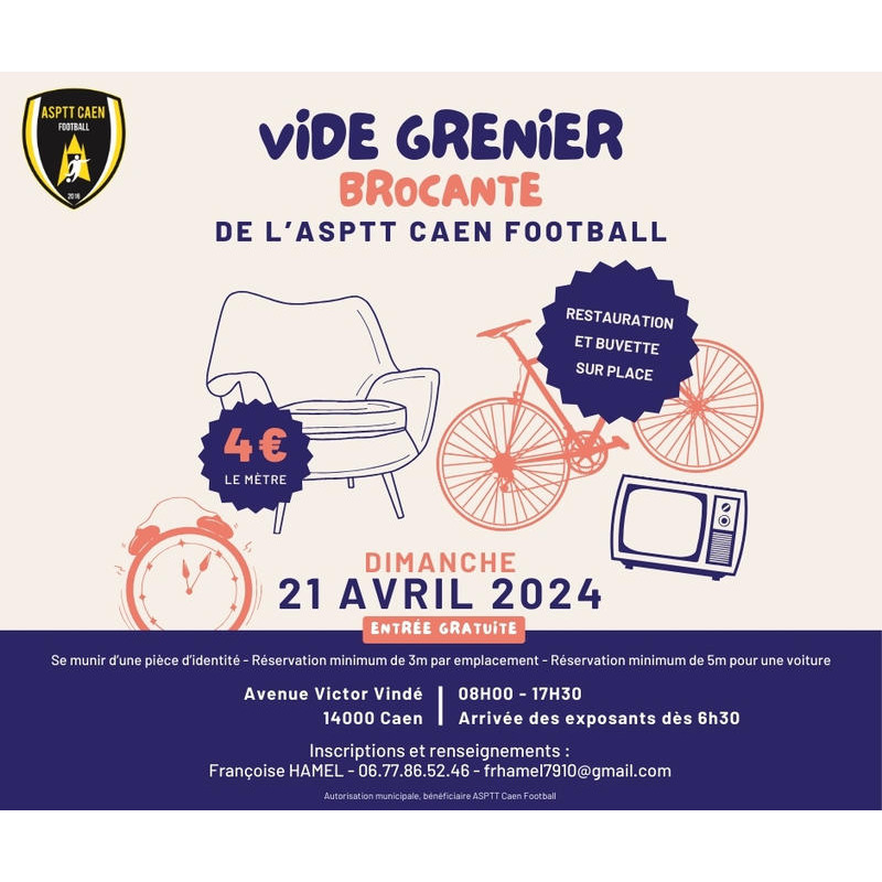 L'asptt caen football organise son 1er vide-grenier le dimanche 21 avril 2024 qui se déroulera avenue victor vindé à quelques encablures de la hache.