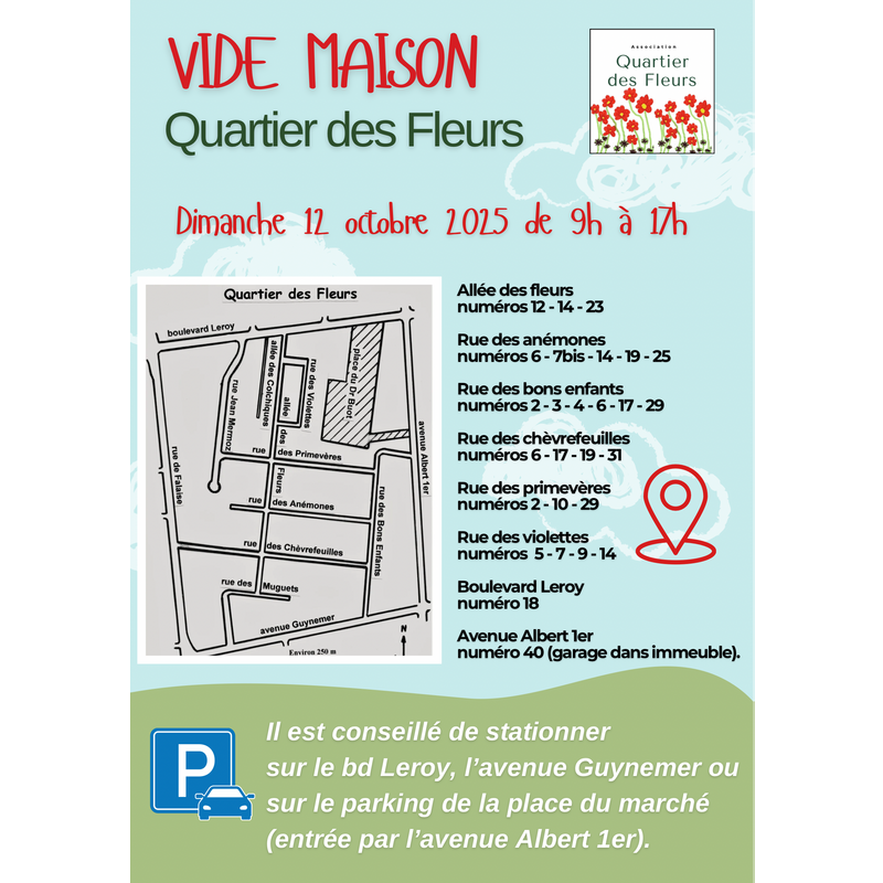 Les rues étant étroites, nous vous recommandons de stationner sur le bd leroy, l'avenue guynemer ou sur le parking de la place du marché du samedi (entrée par l'avenue albert 1er).