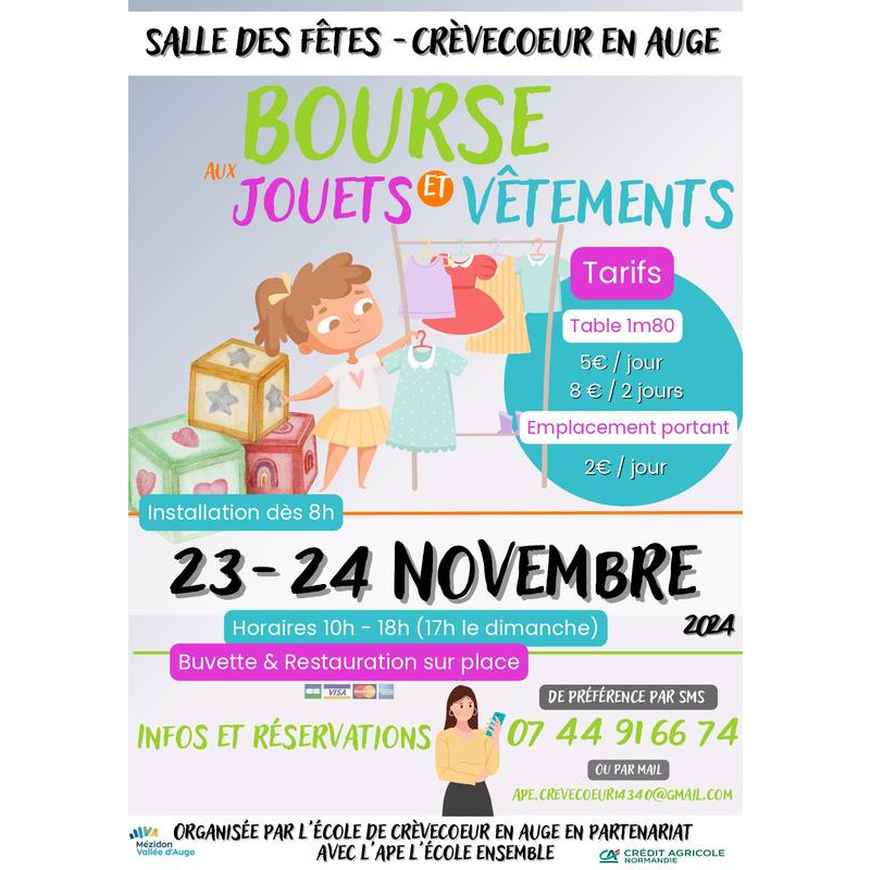 Organisée par l'école de crèvecoeur, cette bourse aux jouets, vêtements enfants ,adultes et matériels de puericultures se déroule sur 2 jours