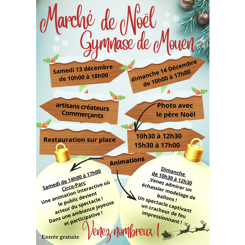 Marché de noël de la commune en intérieur, une trentaine d'exposants seront présents : artisans et créateurs, food-truck, crêpes, gaufres et chocolat chaud.