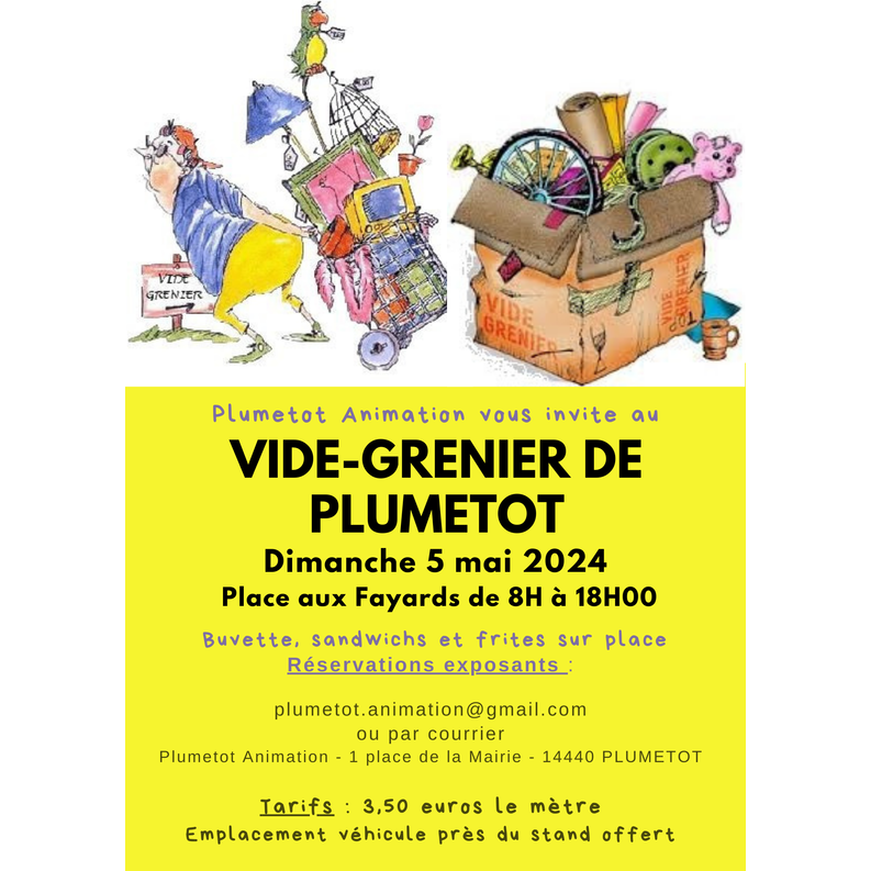 De nouveau, l'équipe de plumetot animation est ravie d’organiser votre vide-grenier le dimanche 5 mai dès 8h00 au cœur du village. Une quarantaine d'exposants sont attendus qui proposeront à la vente leurs trésors : objets, meubles, matériel de bricolage, de jardinage, vêtements, tissus, livres… de belles affaires en perspective sans aucun doute. La buvette vous préparera des boissons froides et chaudes, des crêpes, des frites, des sandwichs saucisse et merguez qu’il vous sera possible de déguster autour d’une table abritée dans une ambiance conviviale !