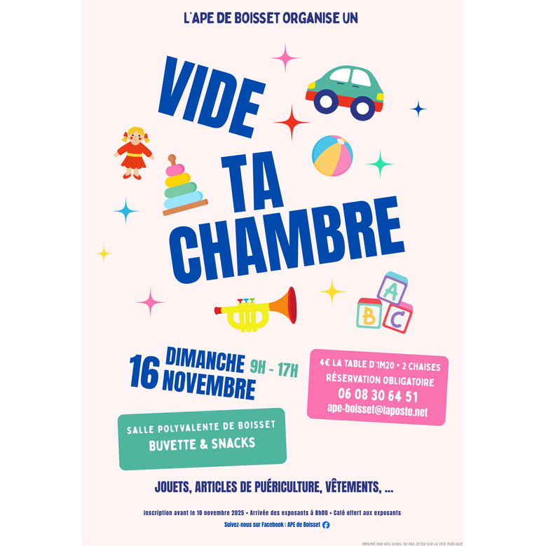 "vide ta chambre" organisé par l'ape de l'école de boisset. Vente de jouets, articles de puériculture, vêtements, ...