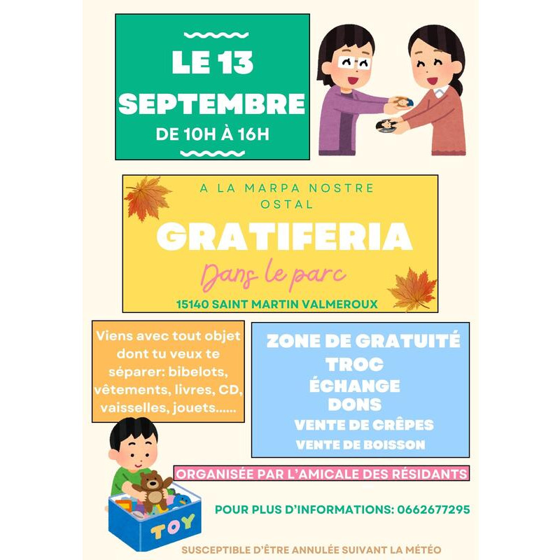 Gratiferia ouverte à tous. Venez proposer en don ou en troc les objets dont vous souhaitez vous débarasser.