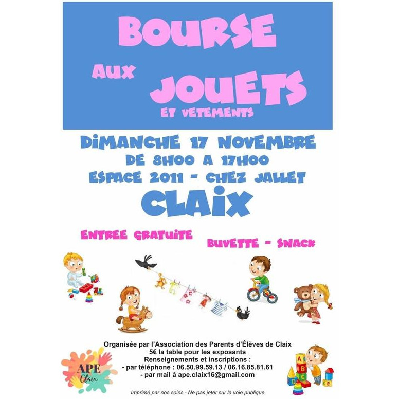 L'association des parents d'élèves de claix (16) organise la bourse aux jouets et vêtements annuelle au profit des enfants de l'école de claix.