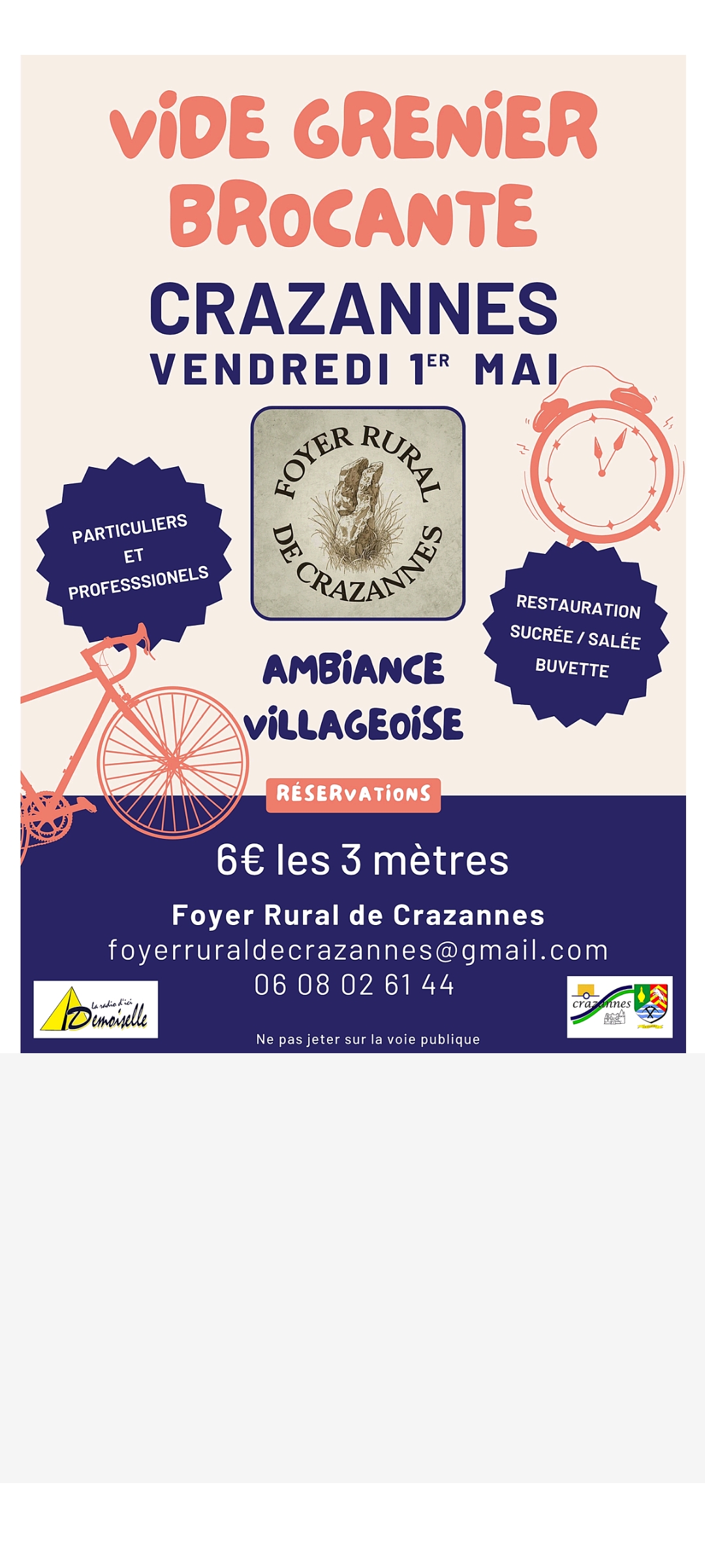 Vide-grenier Brocante organisée par le Foyer Rural de Crazannes dans le centre du bourg inaccessible aux véhicules pendant la brocante.