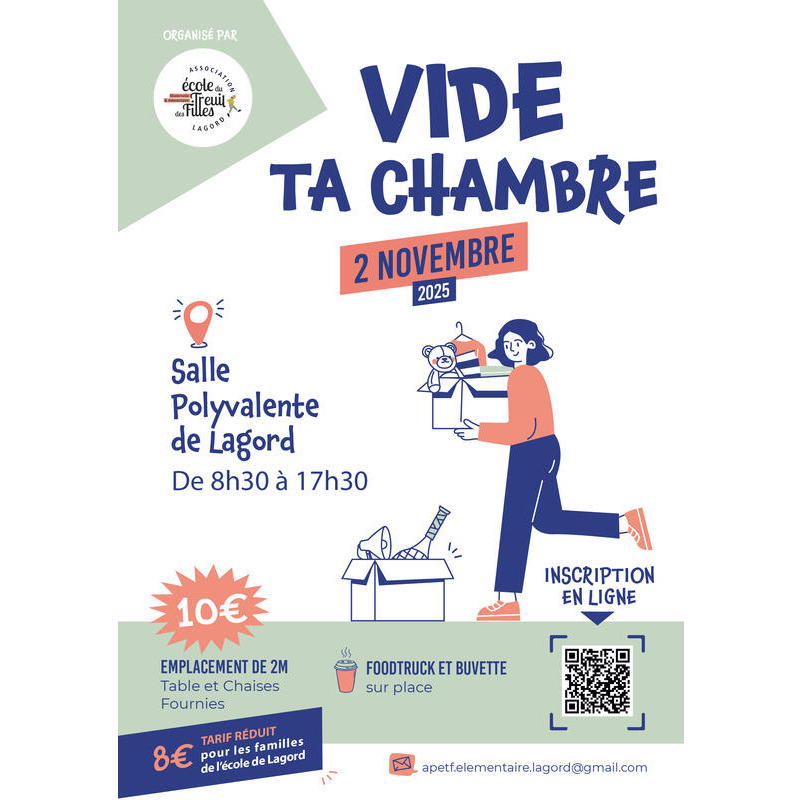 Au programme : l'association des parents d'élèves de l'école élémentaire de lagord vous propose un "vide ta chambre" le 2 novembre 2025. Les bénéfices serviront à financer la fête de l'école élémentaire et/ou seront reversés à la coop de l'école élémentaire du treuil des filles.